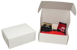 E-Flute corrugated tuck box is available with white material on both sides. If four color process printing is wanted in smaller quantities on boxes, Spot Mounting on the lid only is an affordable option. The paper is printed with the four color process and this is then spot mounted to the lid of the box. One inch tolerance is required on all four sides. Outside Tuck allows the box cover to extend over the outside front of the box. All box material is recyclable.